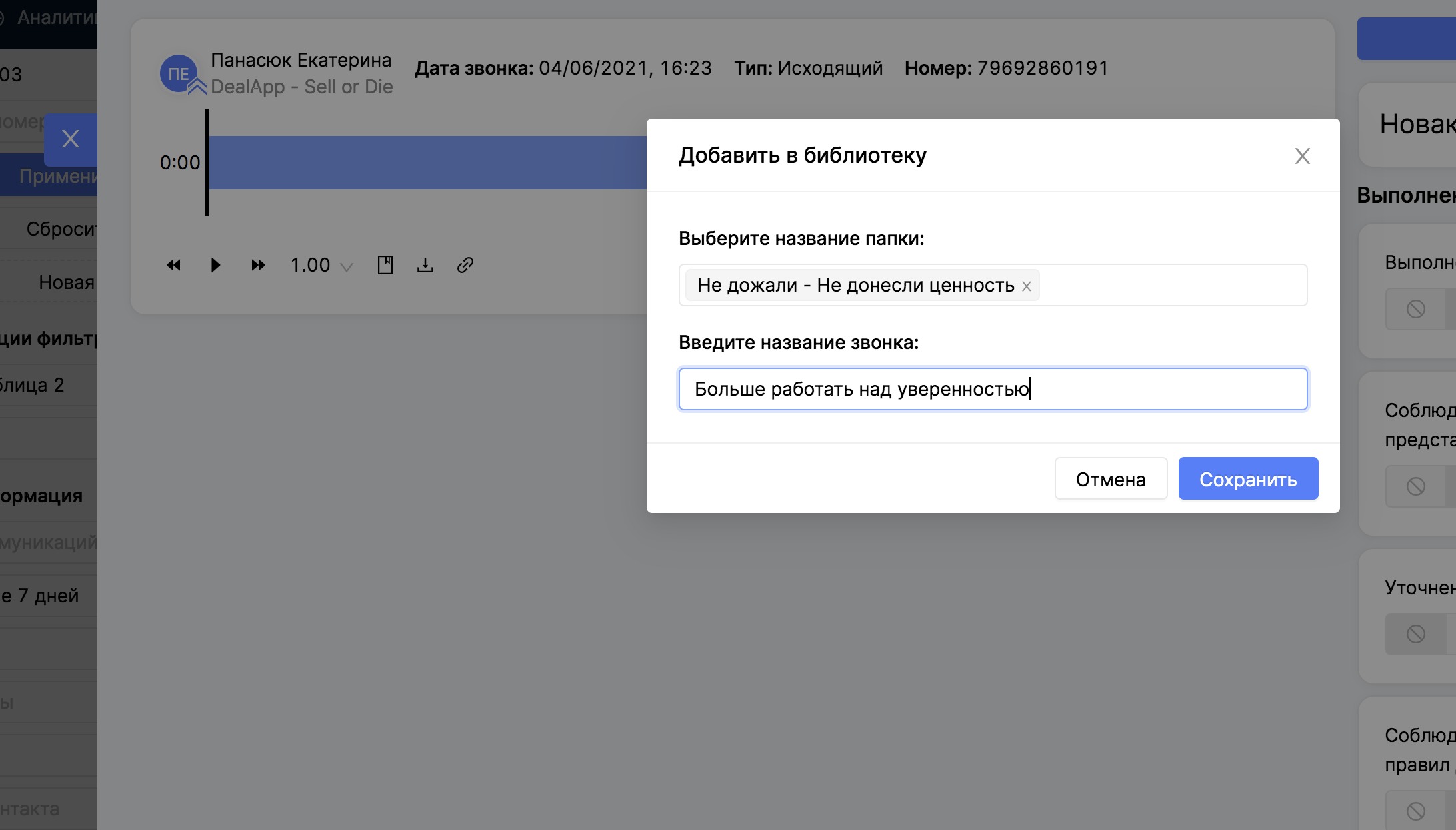 После завершения проверки вы можете добавить звонок в библиотеку звонков (подробнее о Библиотеке звонков здесь). Кнопка добавления в библиотеку прямо под плеером справа от скорости воспроизведения. Напоминаем: для того, чтобы добавить проверку в библиотеку, в ней должна быть хотя бы одна папка.
