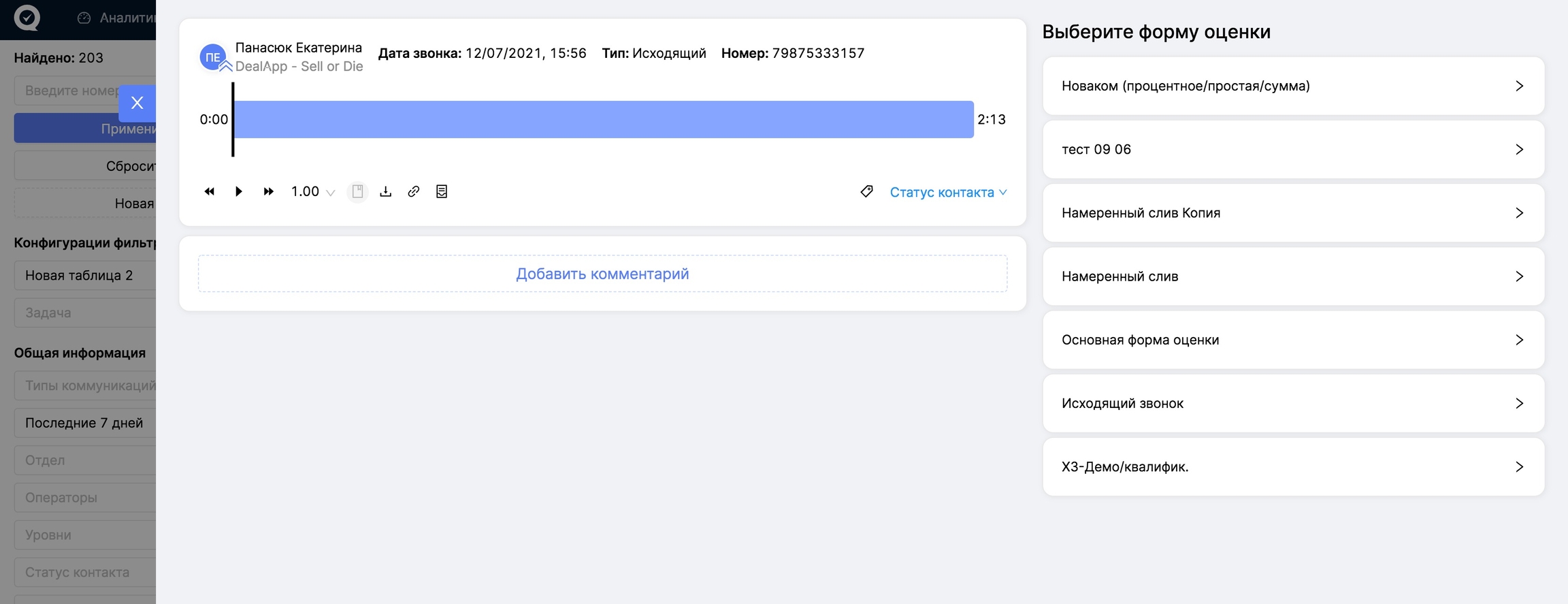 Для того, чтобы оценить звонок, необходимо его найти в Списке коммуникаций при помощи фильтров. Как только вы нашли звонок для оценки - кликните по иконке телефонной трубки. Обратите внимание - вы все еще в списке коммуникаций, вам просто открылось окно с плеером и формами оценки. (Если их нет, а вы уверены, что публиковали их, то проверьте в настройках формы оценки, что вы проставили тип коммуникации и отдел).