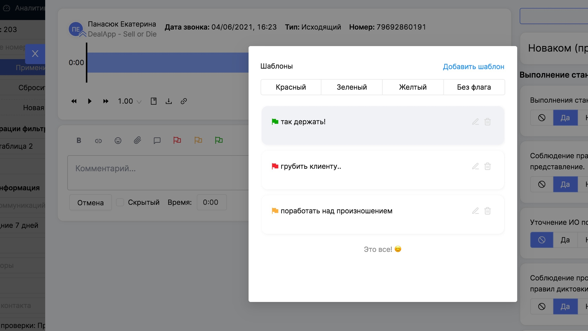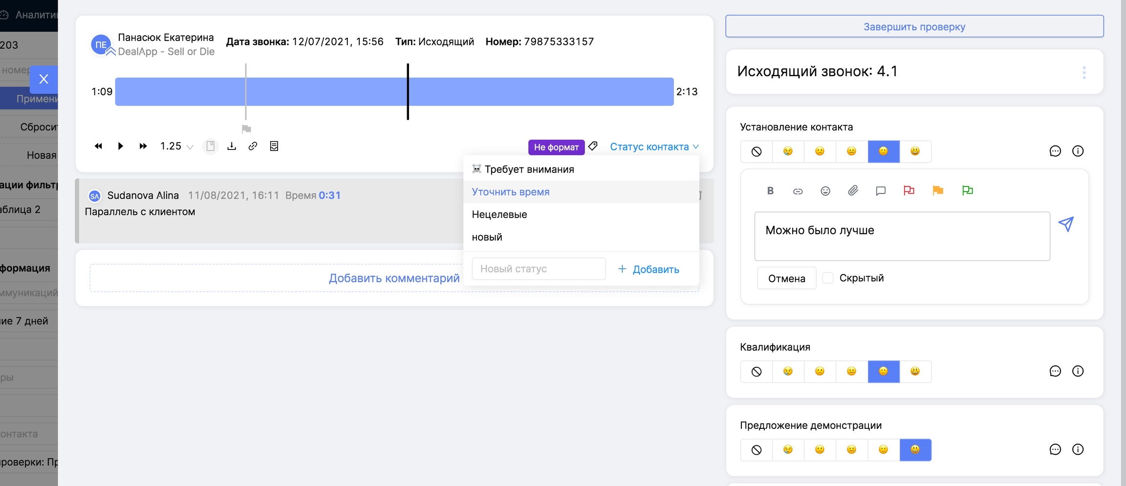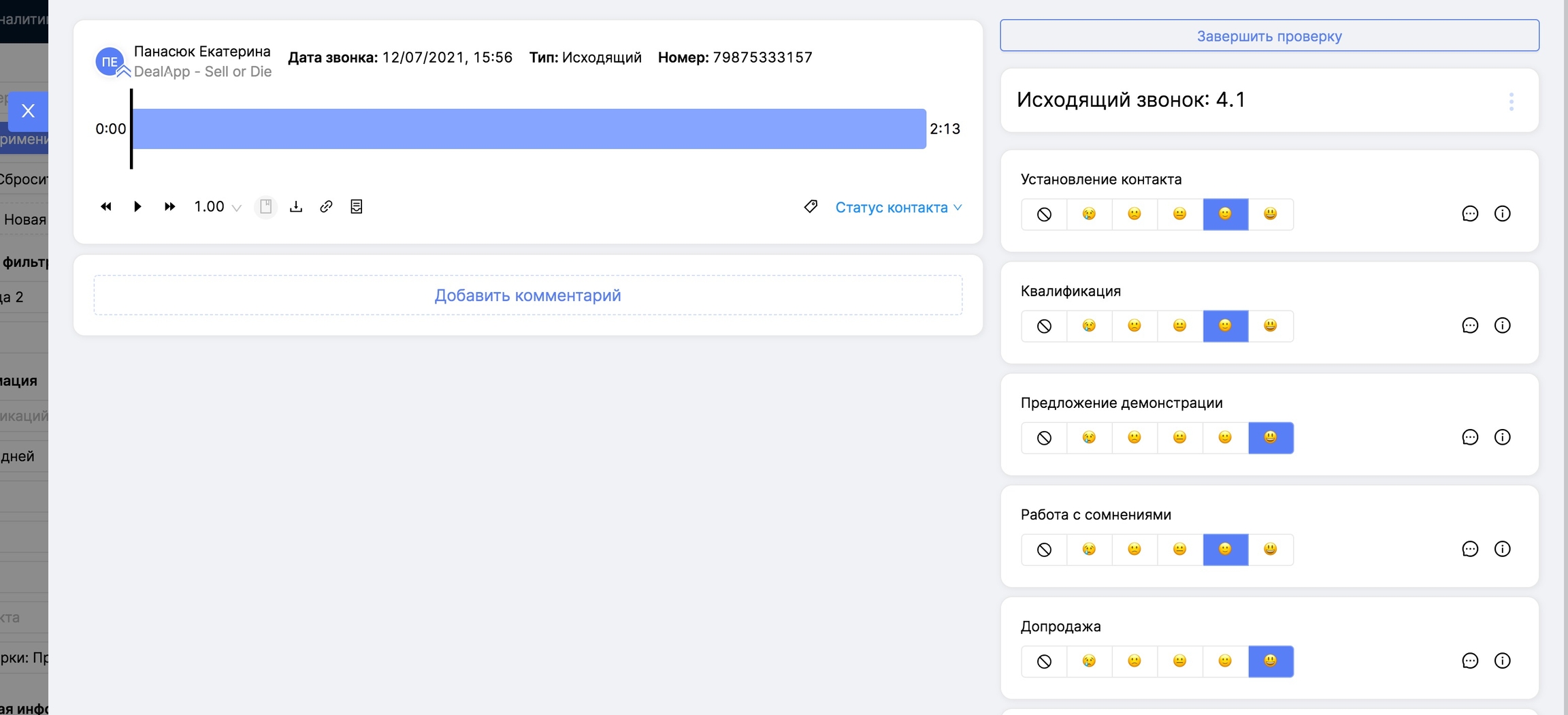 Нажмите на иконку комментария напротив критерия для того, чтобы оставить заметку к конкретному критерию. Нажмите на кнопку Добавить комментарий для того, чтобы оставить комментарий к конкретному моменту разговору. В конце вопросов формы оценки есть место для общего комментария, нажмите на значок "карандаша" и оставьте резюме.
