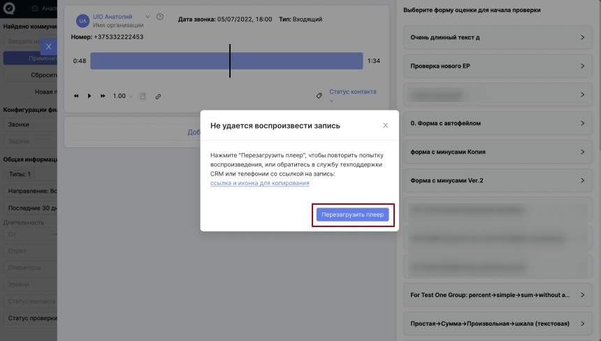 Если после перезагрузки звонок все равно не воспроизводится, скопируйте прямо в этом окне ссылку, нажав на иконку копирования и уточните у поддержки вашей телефонии или СRM, почему данная запись не проигрывается в браузере.
