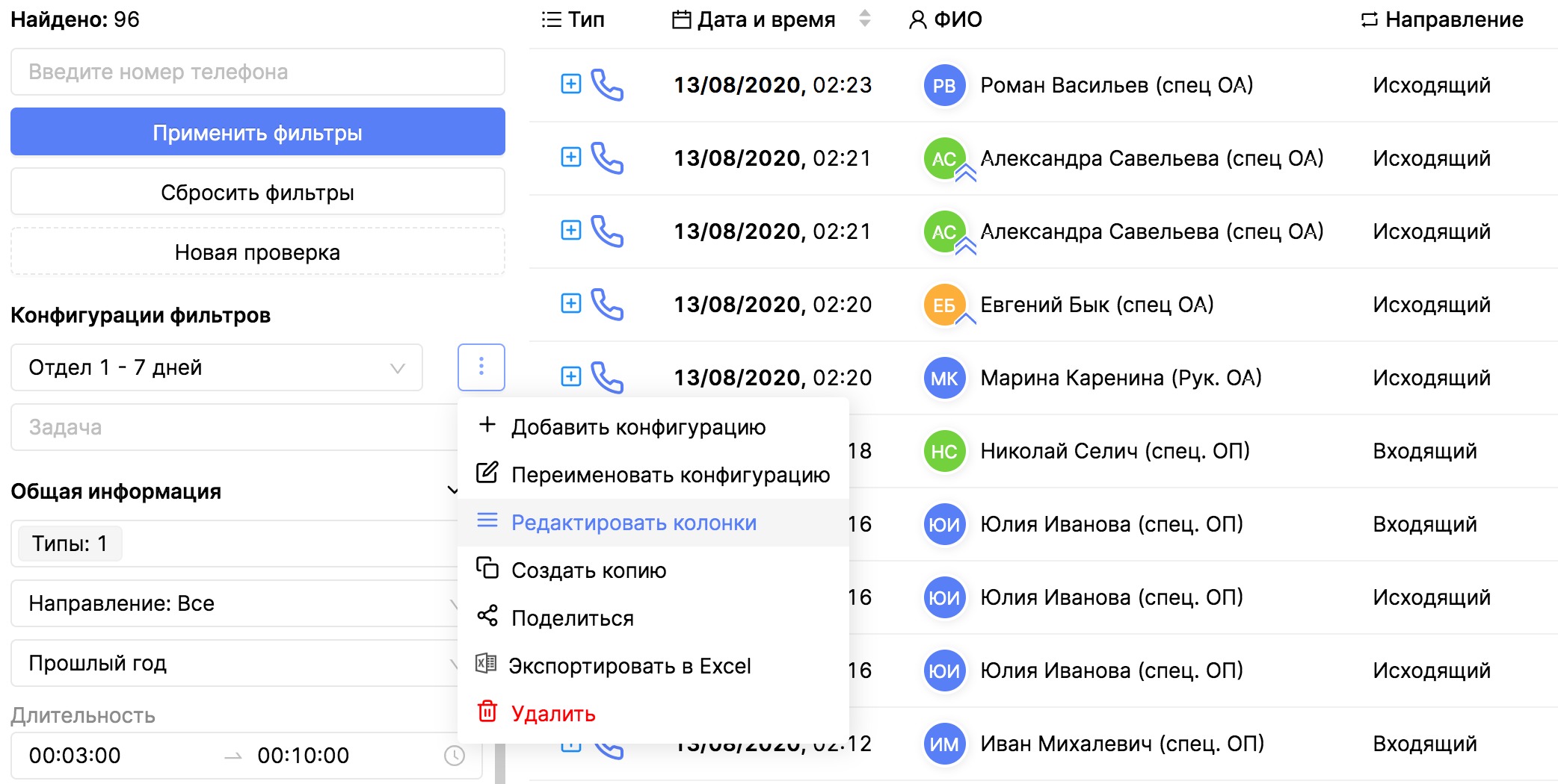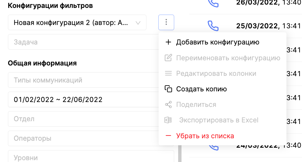 Для того, чтобы настроить колонки в вашей выборке, используйте для этого меню настроек конфигураций фильтров.