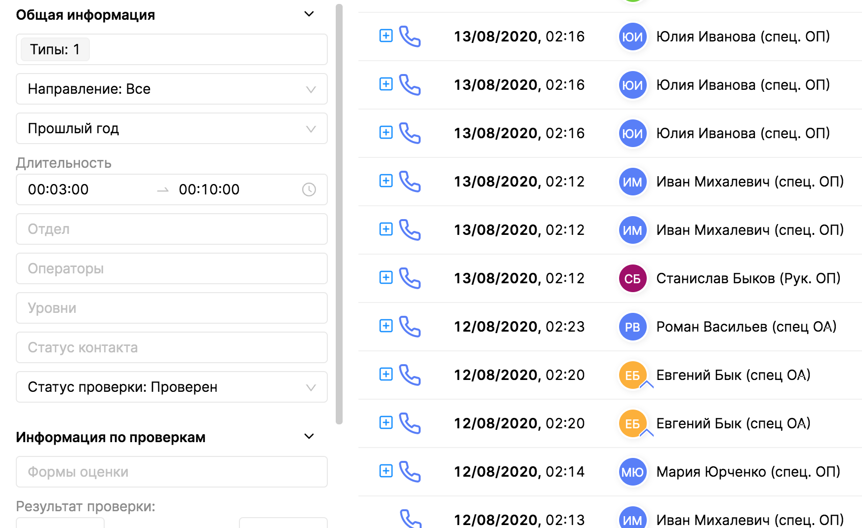 Слева находится зона со всевозможными фильтрами: дата коммуникации, операторы, статус проверки, форма оценки и многие другие. С помощью этих фильтров вы можете по нажатии на кнопку "Применить фильтры" получить выборку звонков по нужным вам параметрам. Расскажем подробнее про фильтры: