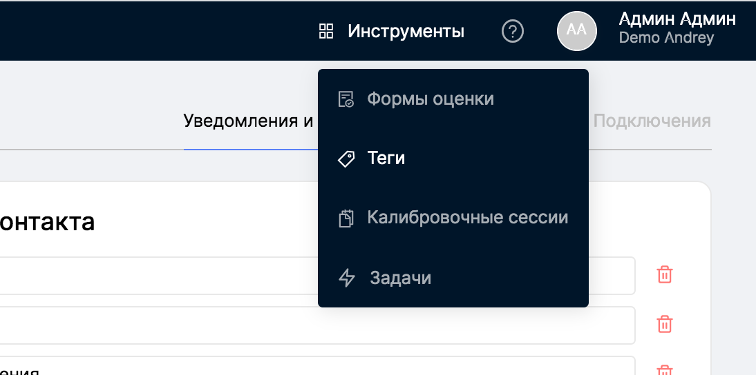 Для создания и настройки тегов в меню Инструменты необходимо выбрать раздел Теги.