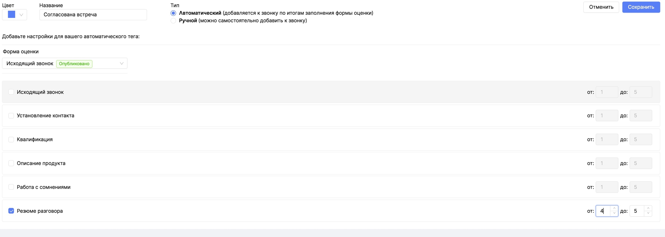 Таким образом настроенный тег "Согласована встреча" сработает, если в критерии Резюме разговора будет выставлено 4-5 баллов.